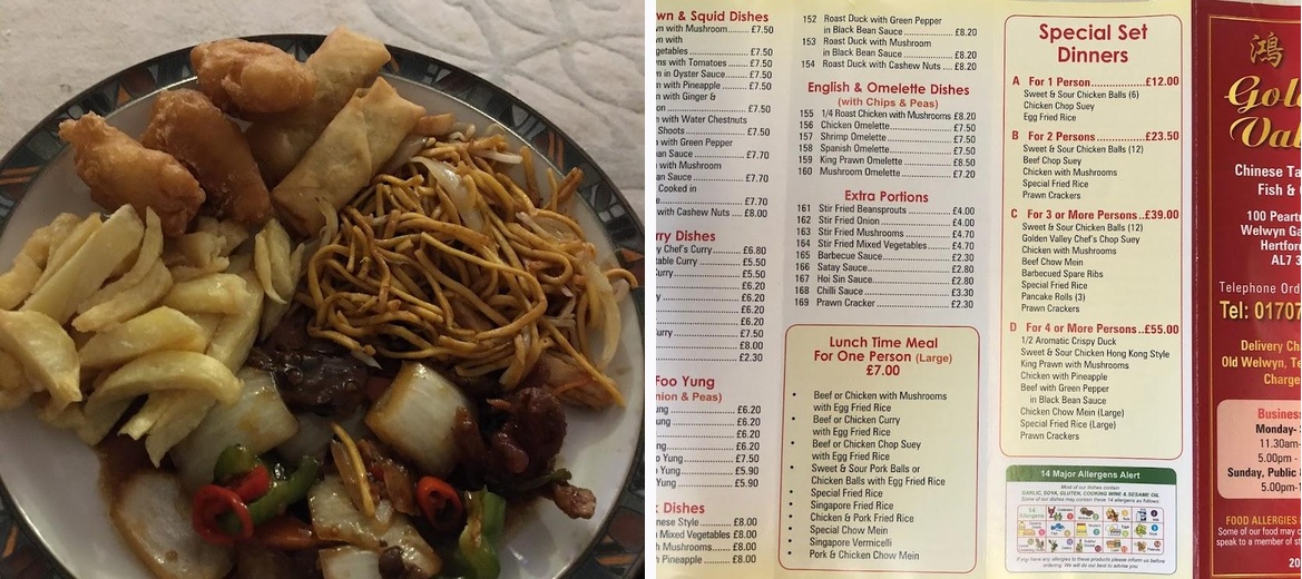 Welcome to Golden Valley, your go-to destination for delectable Chinese cuisine and classic fish and chips in Welwyn Garden City. Located at 100 Peartree Ln, we offer a range of delightful options perfect for lunch or dinner, whether you choose to dine in, take away, or enjoy no-contact delivery. With popular dishes like chow mein and crispy cod, we cater to all cravings, including late-night bites. Our casual atmosphere is complemented by wheelchair accessibility and free street parking. Experience the flavorful dishes our loyal customers adore—visit us today or call +44 1707 324215 to place your order!Patrons love the efficiency of Golden Valley's service, often commenting on the quick turnaround time. Many have enjoyed dining on dishes like the chippy's classic fish and chips, often hailed as some of the best in the area. The extensive Chinese menu receives equal praise, with favorites such as crispy aromatic duck, chow mein, and sweet and sour dishes consistently winning hearts. Customers value the cash-only payment system, as it's straightforward and familiar, but do note that card payments are available via their app and website. The friendly staff enhances the experience, where the combination of polite service and great food keeps customers returning.